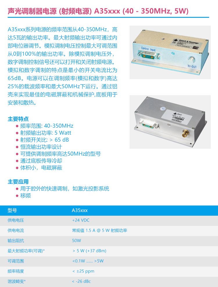 射頻RF驅(qū)動器是用于對聲光器件內(nèi)晶體產(chǎn)生射頻信號。光束被調(diào)制、偏轉(zhuǎn)或調(diào)諧的程度是由射頻信號的頻率和強(qiáng)度來決定的。射頻RF驅(qū)動器主要用來驅(qū)動和控制聲光器件,包括AOM調(diào)制器,聲光偏轉(zhuǎn)器,脈沖選擇器,腔倒空,光纖耦合聲光調(diào)制器,聲光移頻器,聲光鎖模器,多通道AOM調(diào)制器,聲光Q開關(guān),可調(diào)聲光濾波器。我們提供各種優(yōu)化的模擬和數(shù)字控制的高頻驅(qū)動器。我們也可以為客戶定制驅(qū)動器,最大程度地提高客戶所需產(chǎn)品的性能。