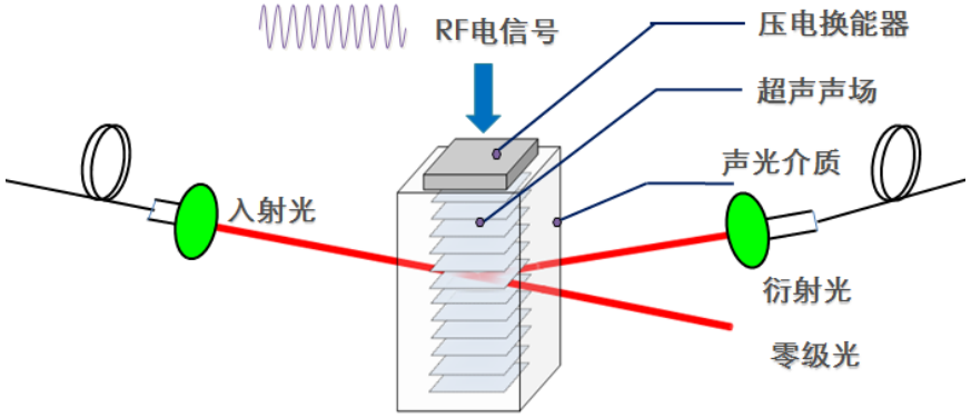 光纖聲光調(diào)制器內(nèi)部主要包含聲光晶體與光纖準直器等,如圖1所示。調(diào)制信號以電信號(調(diào)幅、調(diào)相或調(diào)頻)形式作用于壓電換能器上,通過改變輸入調(diào)制信號的頻率、幅度等輸入特性,實現(xiàn)對輸入激光的調(diào)頻和調(diào)幅。壓電換能器由于壓電效應將電信號轉(zhuǎn)化為相同規(guī)律變化的超聲信號在聲光介質(zhì)中傳播,聲光介質(zhì)的折射率發(fā)生周期性變化后形成一個折射率光柵,激光通過光纖準直器傳入聲光介質(zhì)會產(chǎn)生衍射,衍射光的頻率在原輸入激光頻率上疊加了一個超聲頻率。調(diào)整好光纖準直器位置使光纖聲光調(diào)制器工作在最佳狀態(tài),此時使入射光束的入射角滿足布拉格衍射條件,衍射模式為布拉格衍射,這時入射光的能量幾乎全部轉(zhuǎn)移到一級衍射光中[3]。