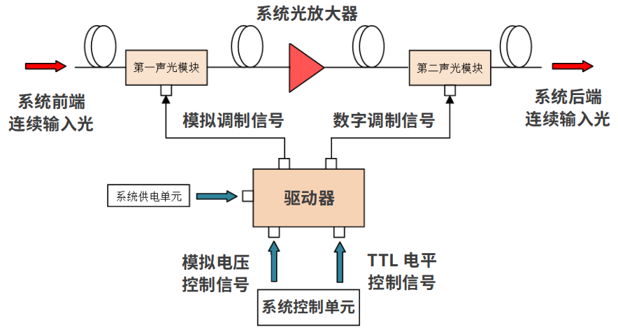 光纖聲光調(diào)制器在全光纖激光鏈路系統(tǒng)中的應用如圖2所示。第一聲光模塊用于系統(tǒng)光放大器前端,對前端連續(xù)輸入光進行光脈沖調(diào)制,調(diào)制后的光脈沖進入系統(tǒng)光放大模塊進行能量放大。第二聲光模塊用于光放大器后端,其作用是對系統(tǒng)放大后的光脈沖信號基底噪聲進行隔離。