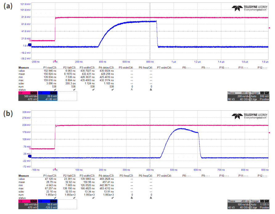 在全光纖激光鏈路中,光纖聲光調(diào)制器的快速光脈沖上升時間,最大程度地保證系統(tǒng)信號脈沖能夠有效通過,同時避免基底噪聲進入時域聲光快門(時域脈沖門)。實現(xiàn)快速光脈沖上升時間的核心是減少超聲波穿過光束的渡越時間,主要方法是減小入射光束腰直徑或者采用聲速大的材料制作聲光晶體[5]。以“夢天”冷原子柜中使用的 SGTF200-1064-1PFG-HP 型高性能保偏光纖聲光調(diào)制器為例,光束束腰直徑減小至亞微米級,且采用特殊切向的新型材料,實現(xiàn)了上升時間小于10 ns,實測圖如圖7所示。