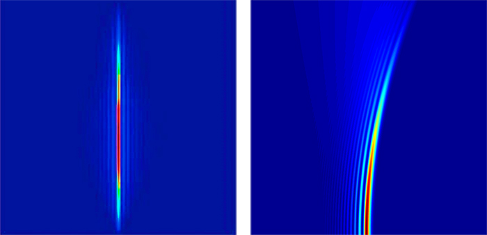 常見的無衍射光束,左圖.貝塞爾光束在焦點附近的強度分布(x-z平面) 右圖.艾里光束自成型面逐漸衰減的強度分布(x-z平面)